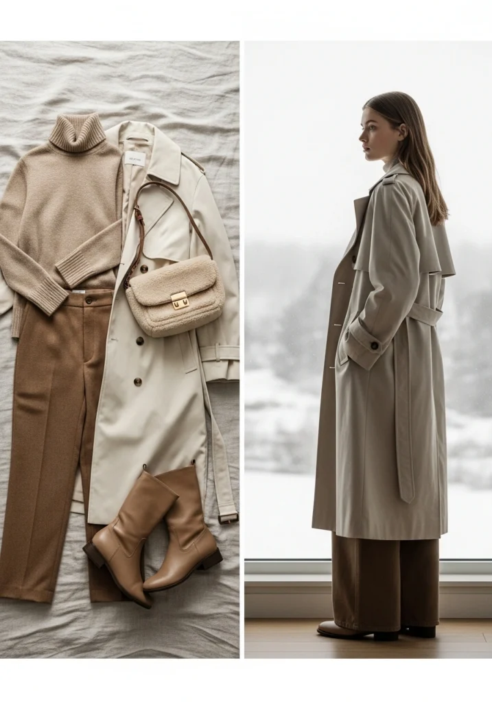 Layer tones of beige, ivory, and taupe: think a cashmere turtleneck, wool trousers, and a trench coat. A pop of texture via a shearling bag ties it together. This palette is timeless and Pinterest-gold.