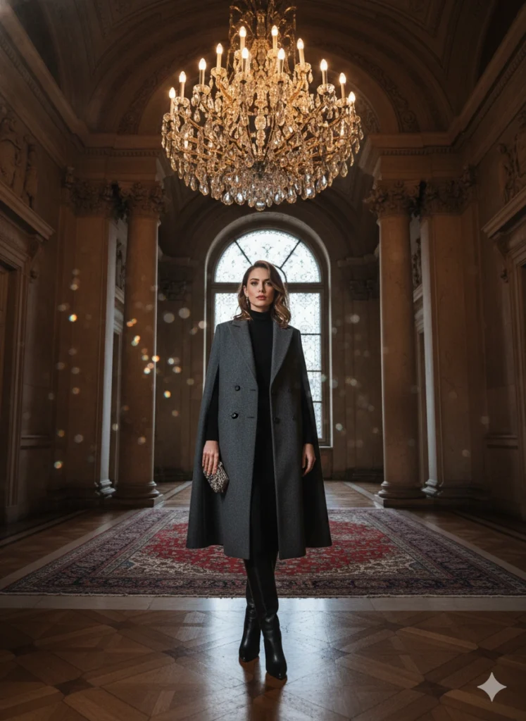 For special occasions, a wool cape coat is unmatched. Layer over a turtleneck dress and tall boots. The silhouette is dramatic yet surprisingly wearable.