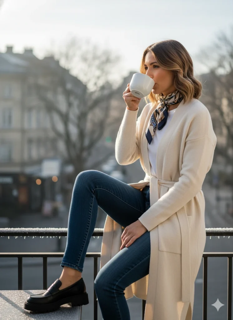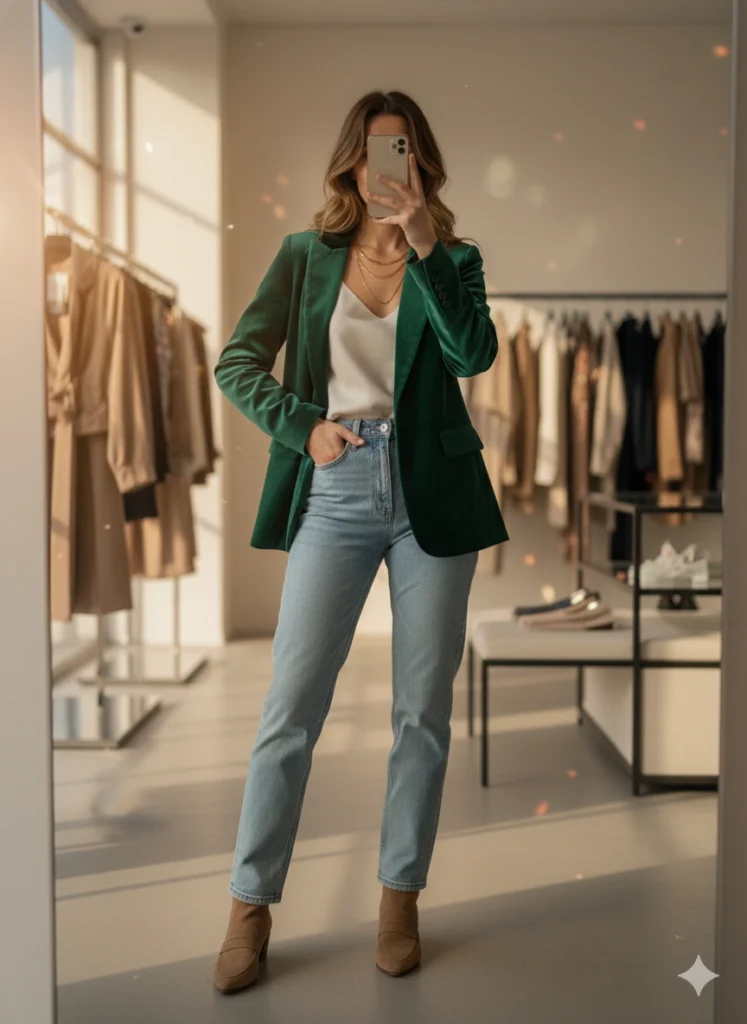 Velvet is winter’s secret weapon. A rich emerald or midnight blue blazer looks stunning over light-wash jeans and a silk camisole. Add delicate gold necklaces and suede loafers.