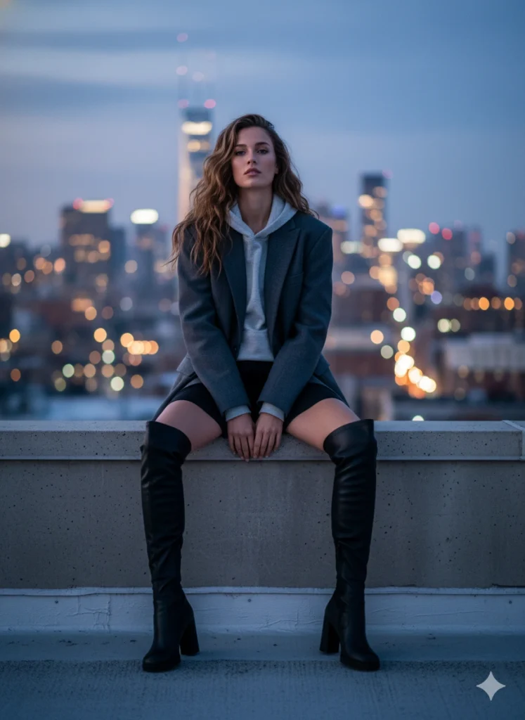 Yes, it’s acceptable in 2025. Layer a slim hoodie beneath an oversized blazer, then add tailored shorts and over-the-knee boots. The mix of casual and sharp is pure genius.