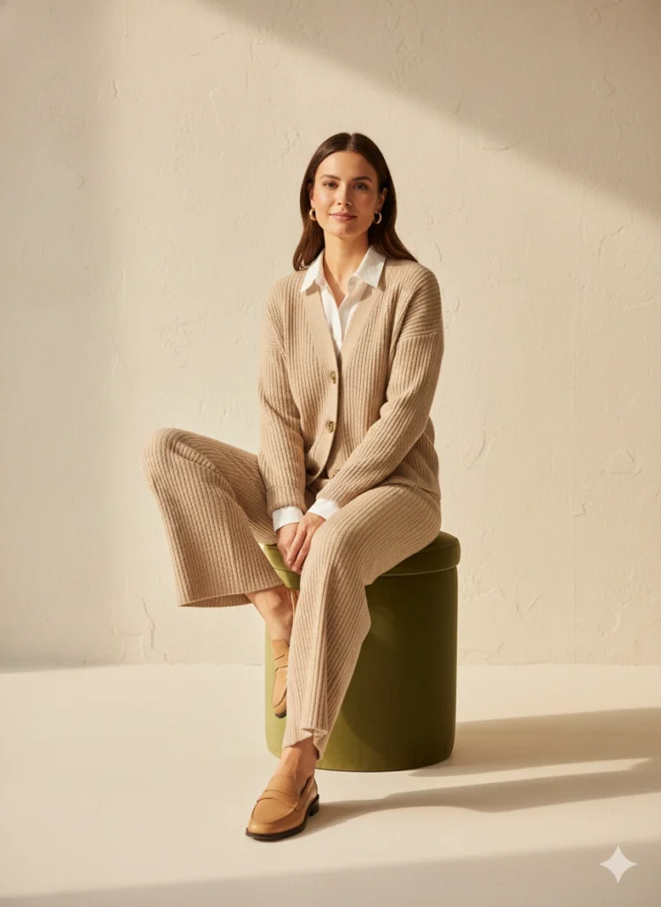 Matching knit sets are everywhere this season. Opt for a ribbed cardigan and wide-leg pants in soft gray or oatmeal. Layer a collared shirt underneath for texture play, and slip on loafers or ballet flats.