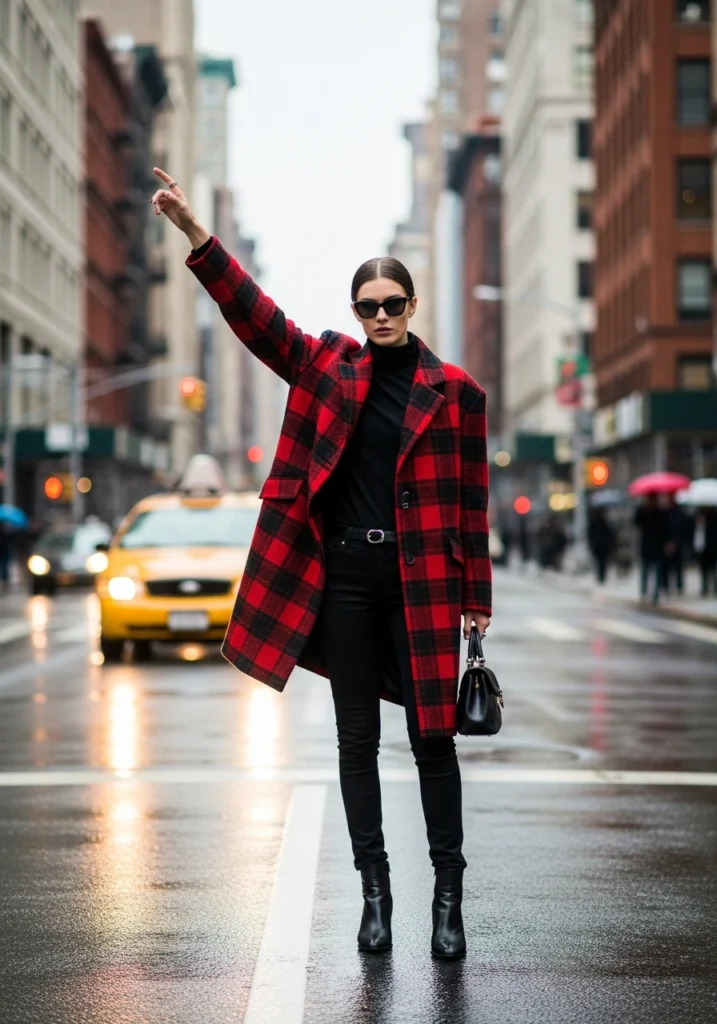 Let a bold plaid coat do the talking. Keep the rest simple: black turtleneck, black skinny jeans, black boots. The monochrome base makes the pattern pop without overwhelming.