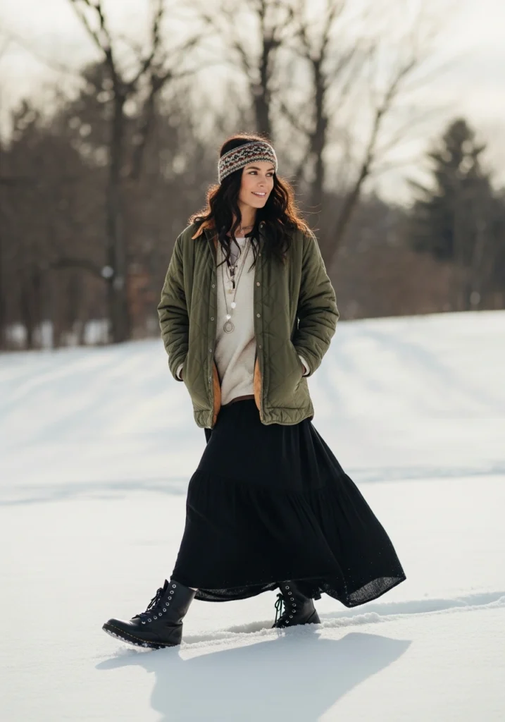 A lightweight quilted liner jacket (think barn jacket vibes) pairs beautifully with a flowy maxi skirt and a fitted thermal top. Combat boots ground the look.