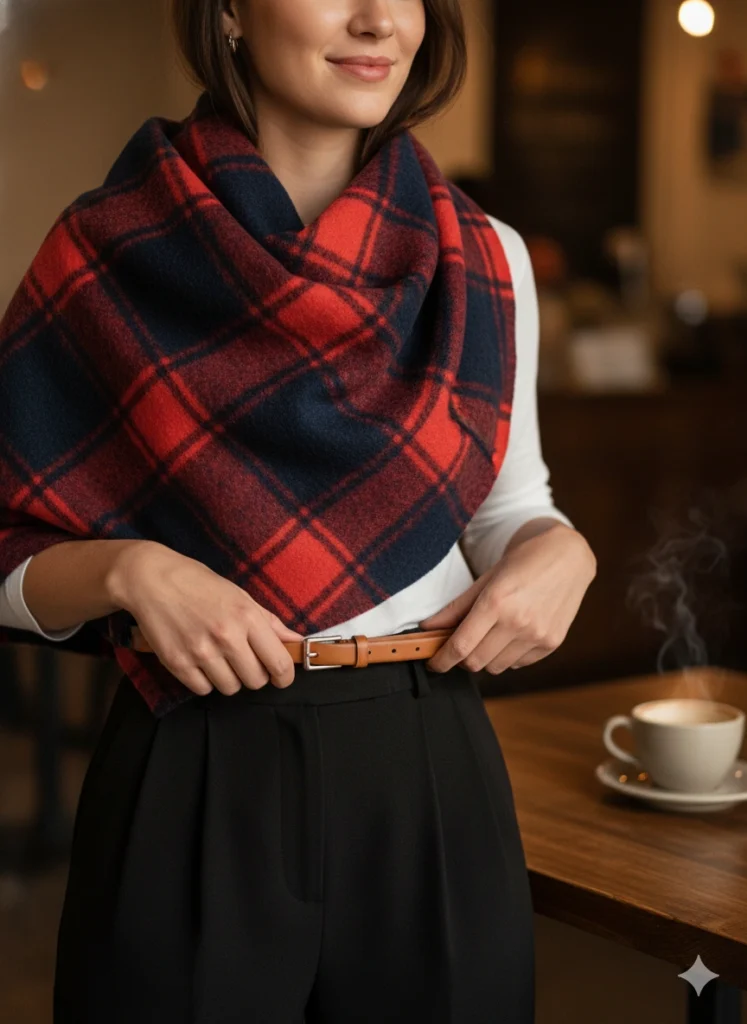 Drape an oversized plaid scarf over a fitted long-sleeve tee, belting it at the waist. Pair with tailored trousers and heeled boots. This Scandinavian-inspired hack adds warmth and dimension.