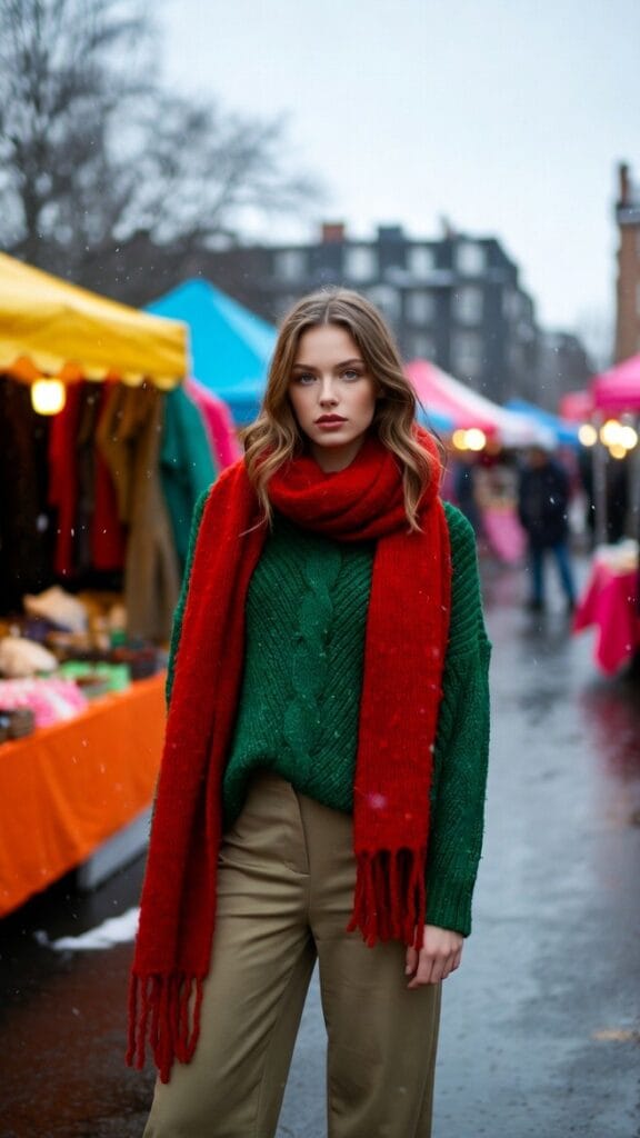 Build winter outfits 2025 around one bold color. Start with a jewel-tone sweater and add neutral bottoms. It’s an easy way to add winter fashion inspo without trying too hard.