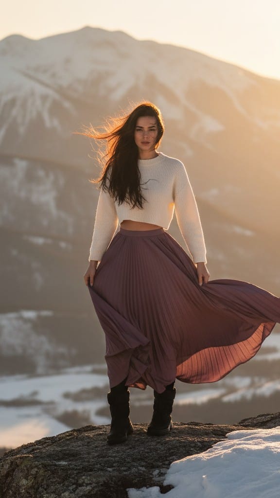 Maxi skirts and dresses are ruling winter outfits 2025. They cover up more, keeping legs warm, and look elegant with boots. Pair with a cropped sweater for balance.